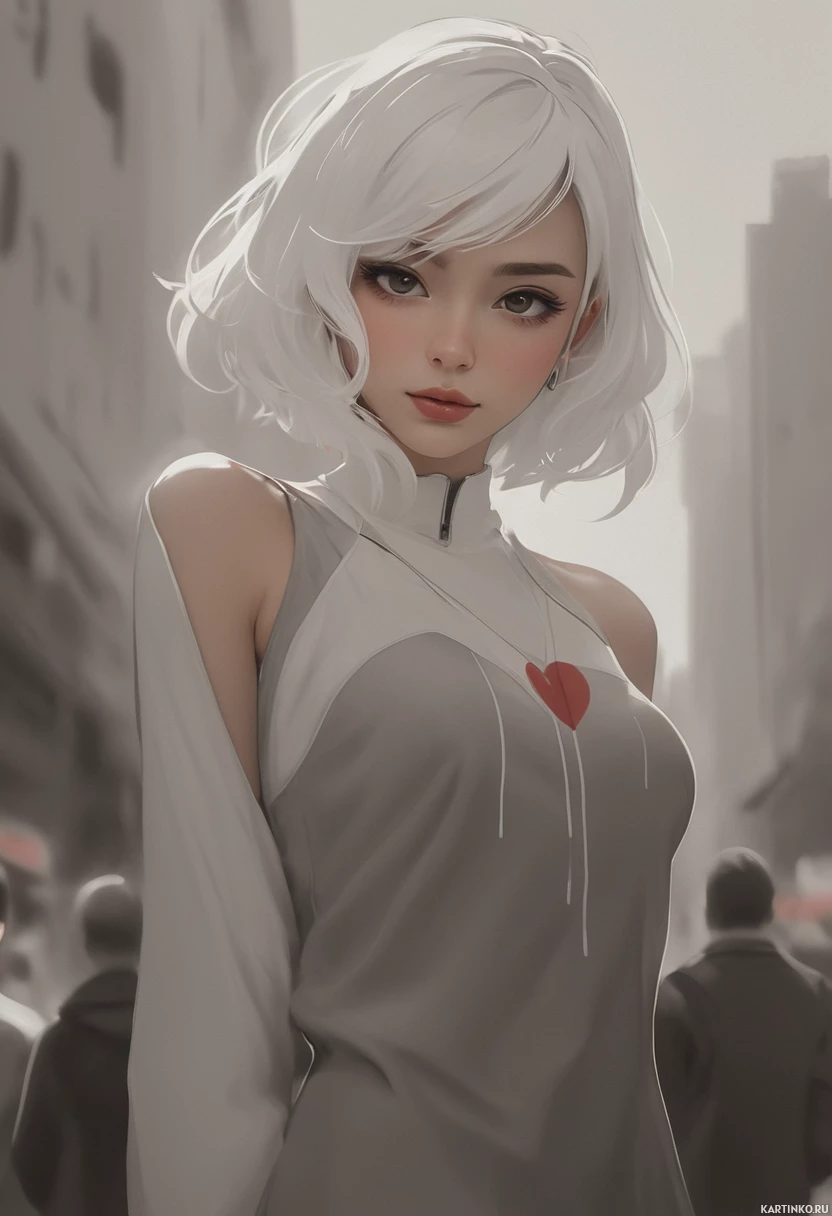 a sleeveless top that seems to have a heart-shaped emblem on it. Her stance suggests confidence as she looks directly at the viewer. In the background, there are blurred figures of other people in what looks like a busy
