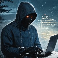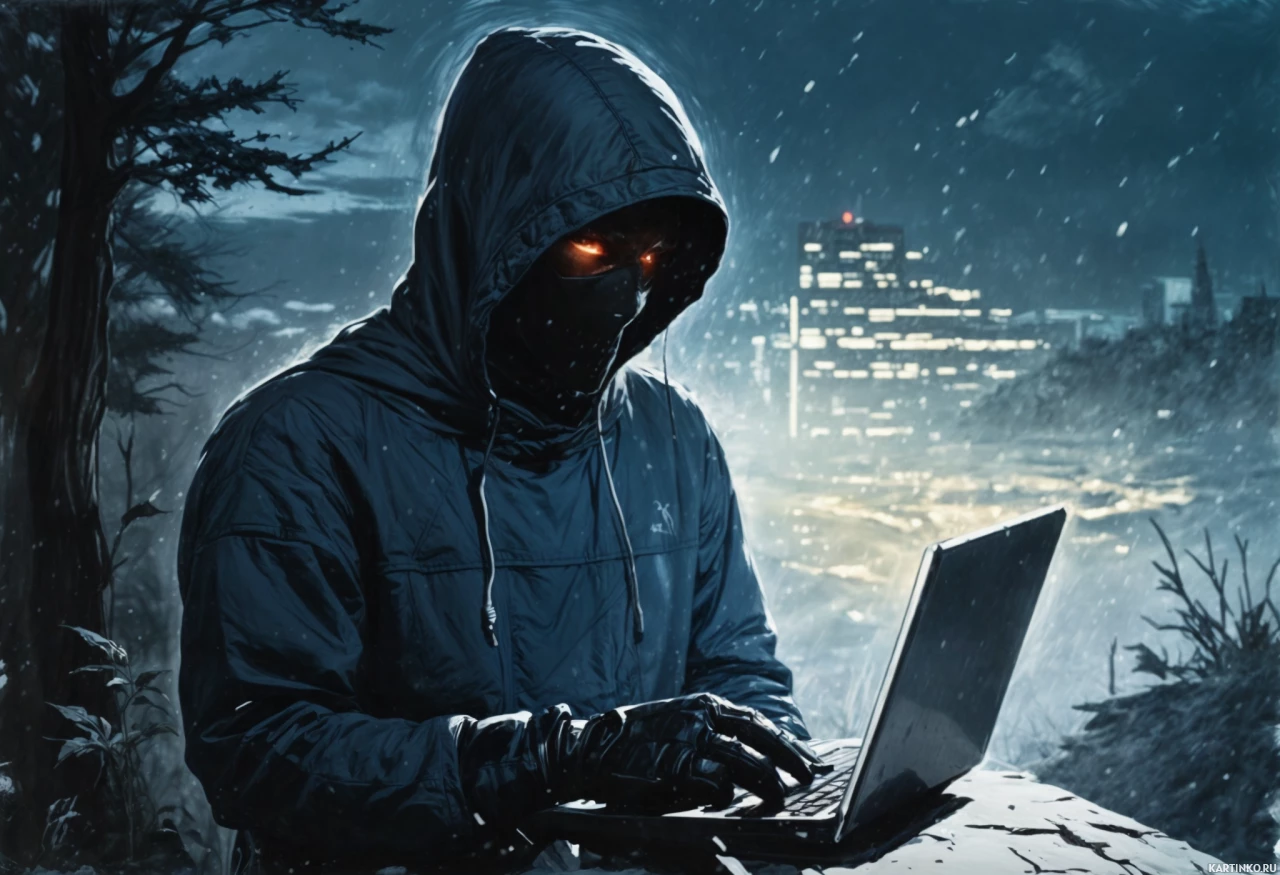 На картинке изображен человек в темном капюшоне, работающий за ноутбуком. Нижняя часть его лица скрыта светящейся красной маской. Фон указывает на ночную сцену: на заднем плане видны деревья, возможно, открытое пространство, а вдалеке – здания, освещенные искусственным светом.