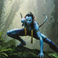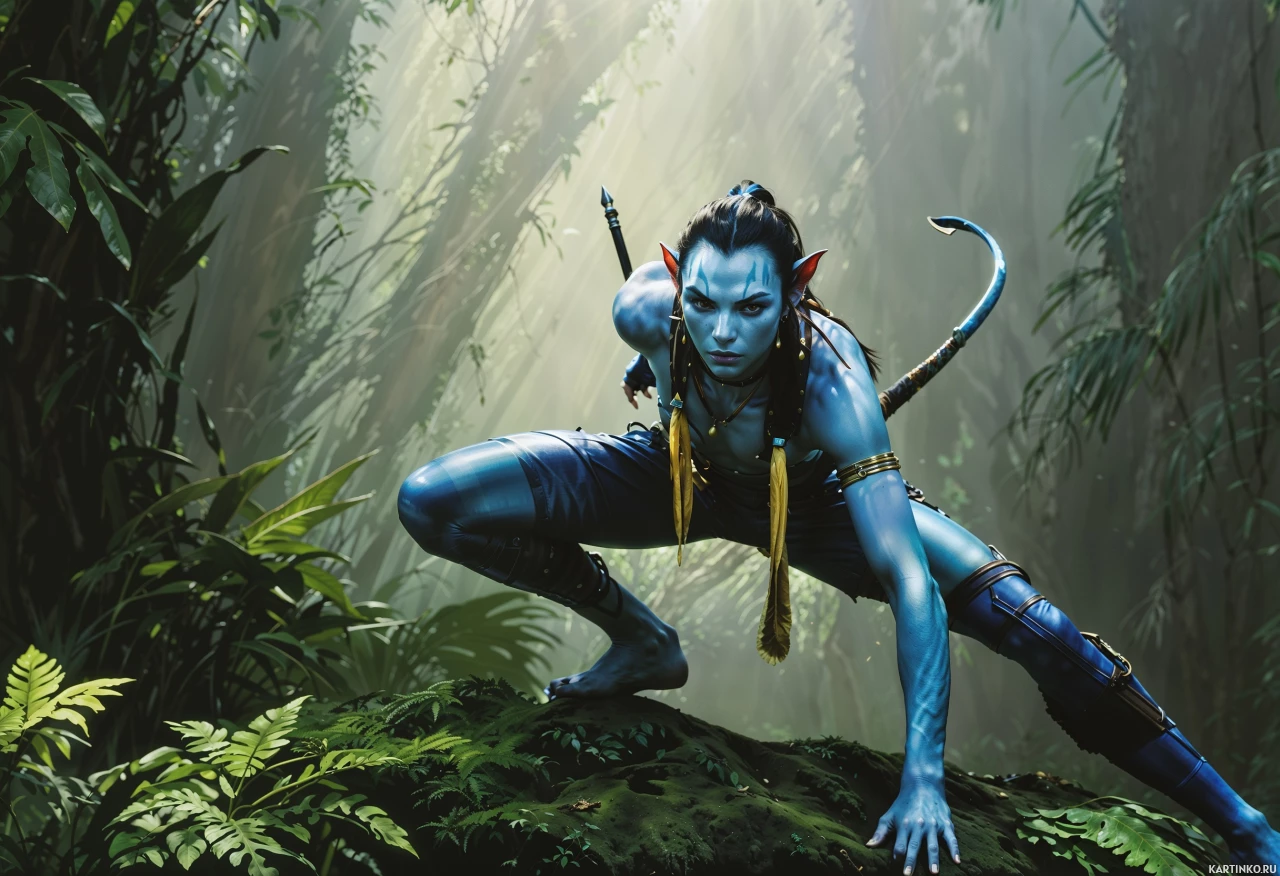 In the image, there is a figure that appears to be from the movie "Avatar". The character is depicted in a crouching pose with one hand gripping a bow and arrow, while the other hand holds a staff. They are dressed in