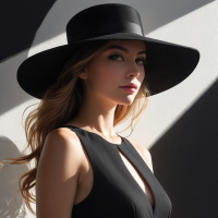 black hat that adds a fashionable element to her outfit. Her gaze is directed off to the side, and she has