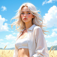 На картинке молодая женщина с белыми волосами стоит в поле с высоким колосом. На ней светлый верх и бежевые брюки. Она расслаблена, одна рука у нее на бедре, другая слегка отсторонена от тела. Ее взгляд направлен в сторону, придавая ей задумчивое выражение. За ней – чистое голубое небо, что говорит о раннем утре или позднем вечере, судя по мягкому освещению.