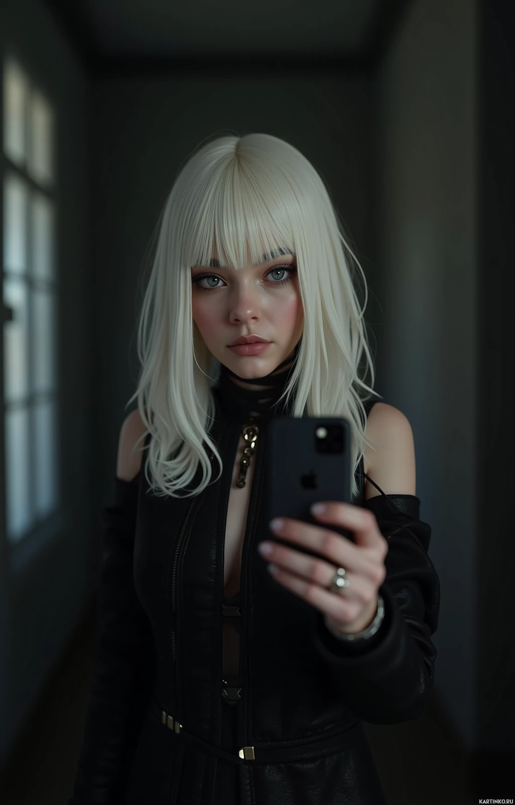 На картинке – девушка с белыми волосами. На ней чёрный кожаный наряд и ботфорты на высоком каблуке. Одежда украшена молниями и шипами, создавая одновременно дерзкий и стильный образ. В левой руке она держит телефон и делает селфи. На заднем плане, похоже, помещение с деревянным полом.