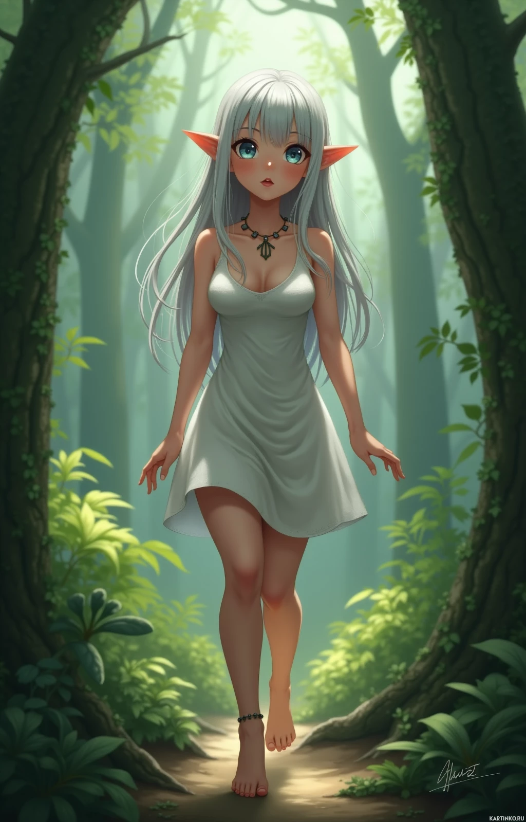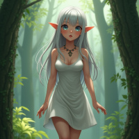 white hair and pointed ears, typically associated with elves in fantasy settings. This character is shown from the waist up, standing on what appears to be a path through a lush