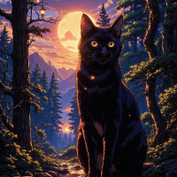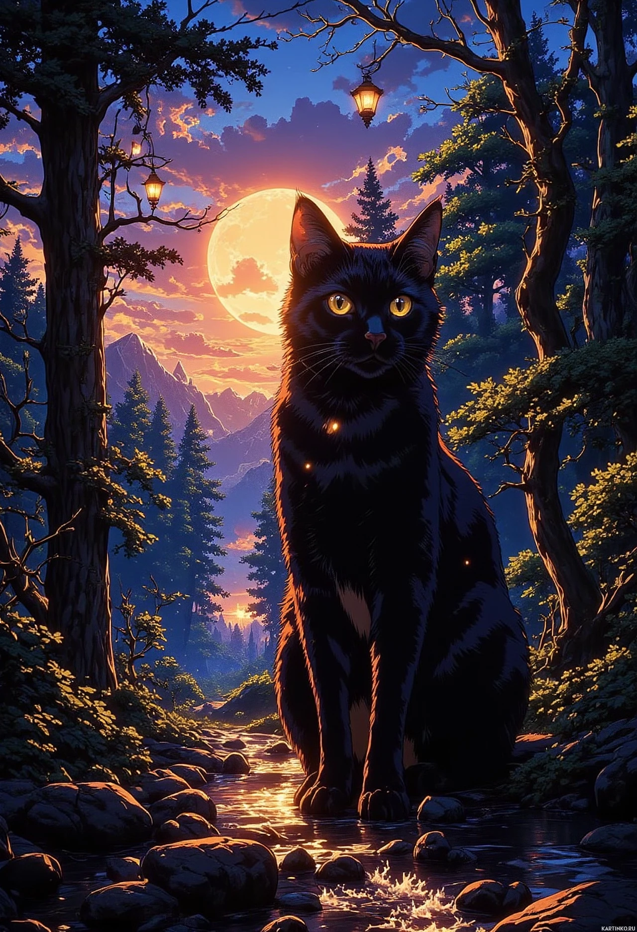 full moon hangs low in the sky, adding to the magical quality of the scene. There are also other trees and shrubbery visible around the cat, contributing to a serene and natural environment. The lighting suggests either dawn or dusk, given the contrast between