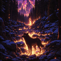 volcanic rock, with lava flowing in the background. The sky is dark and has an aurora-like glow, suggesting that it might be nighttime or twilight. There are trees and bushes around, indicating