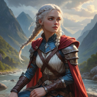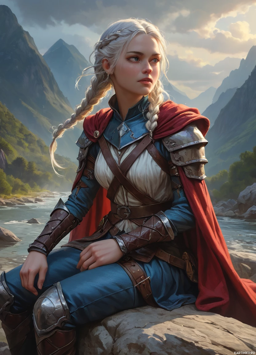 a red cloak. She appears to be wearing a breastplate and has an axe resting nearby. The setting seems to be