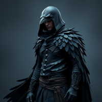 a distinctive outfit that includes a hood with feathers attached to it, giving the impression of wings. The cloak is dark and seems to have a bird-like design. The character's attire suggests they might have a role related to stealth or ranging due to the resemblance to an assassin's outfit. The person is looking directly at the viewer with