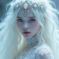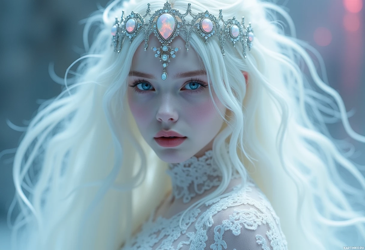 small gems that catch the light, and her attire seems to be a blend of ethereal and traditional elements. The setting suggests an otherworldly environment, possibly inspired by