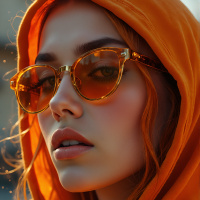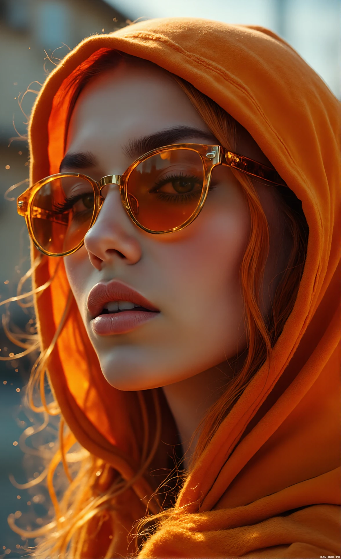 red hair wearing an orange hood and sunglasses. The individual is looking directly at the camera, giving off a cool and casual vibe. The background is out of focus but suggests
