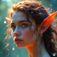 forest environment. There's a subtle dusting of sparkling particles around her face and hair, adding to