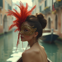 a blurred backdrop that suggests a canal-like setting, possibly Venice based on the architectural style visible. The overall mood of the image is artistic and somewhat mysterious due to the mask and the backdrop.