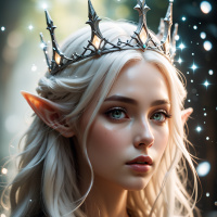 white hair and pointed ears, resembling an elf. She is wearing a crown on her head, suggesting she may be portraying a royal or magical character. Her expression is serene and she has