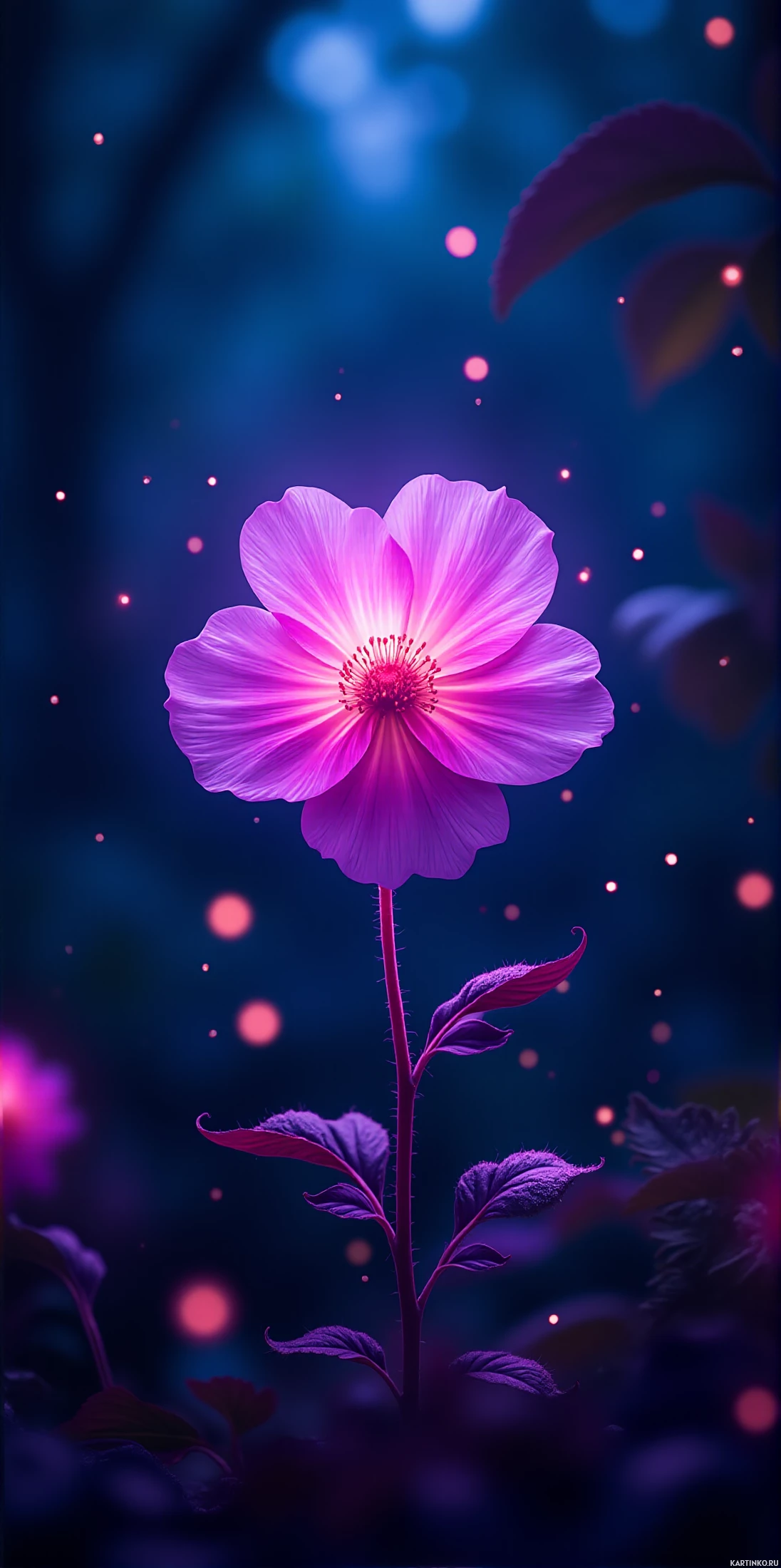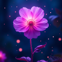 На картинке изображен один фиолетовый цветок с пятью лепестками и более темным центром, одиноко стоящий на переднем плане на фоне ночного неба. Вокруг цветка разбросаны мелкие малиновые искорки, создающие волшебный эффект. У основания стебля цветка едва заметны зеленые ростки. Общая атмосфера создает ощущение спокойствия и таинственности.