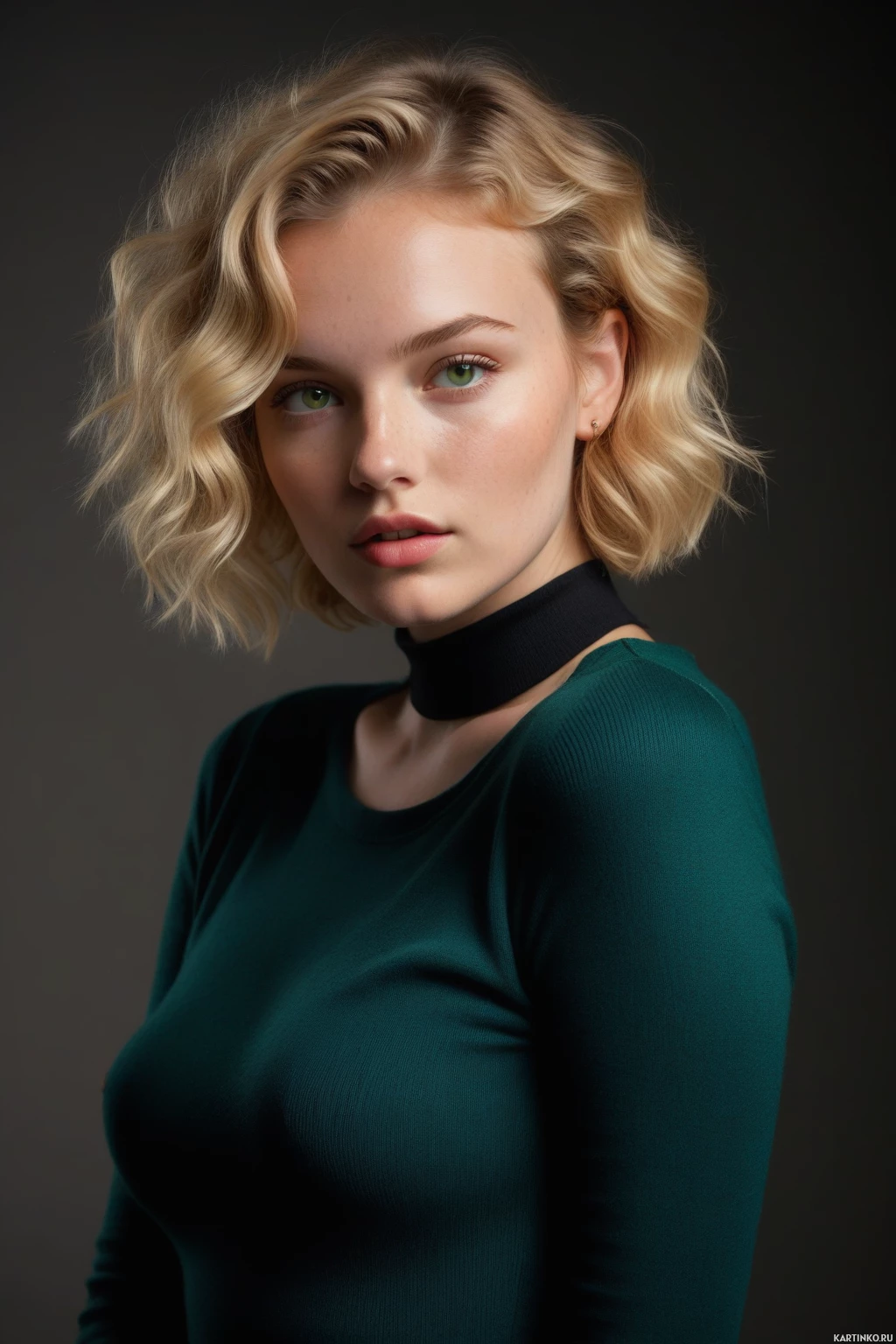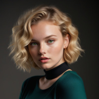 На картинке изображена женщина с волосами до плеч, уложенными с боковым пробором, с прядями светлых волос, спадающими на глаз и на лоб. У неё нейтральное выражение лица, она смотрит прямо в камеру. Макияж включает чётко очерченные брови, выразительные скулы и подчеркнутые веки, придающие лицу скульптурный вид. На ней тёмный топ с длинными рукавами, а фон переходит от серого к чёрному.