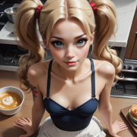 blue eyes and wears makeup that includes eyeliner and lipstick. Her facial features are exaggerated for a cartoonish effect. The girl is dressed in