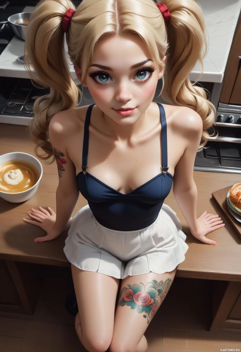 a young woman with blonde hair styled into pigtails adorned with red bows. She has large
