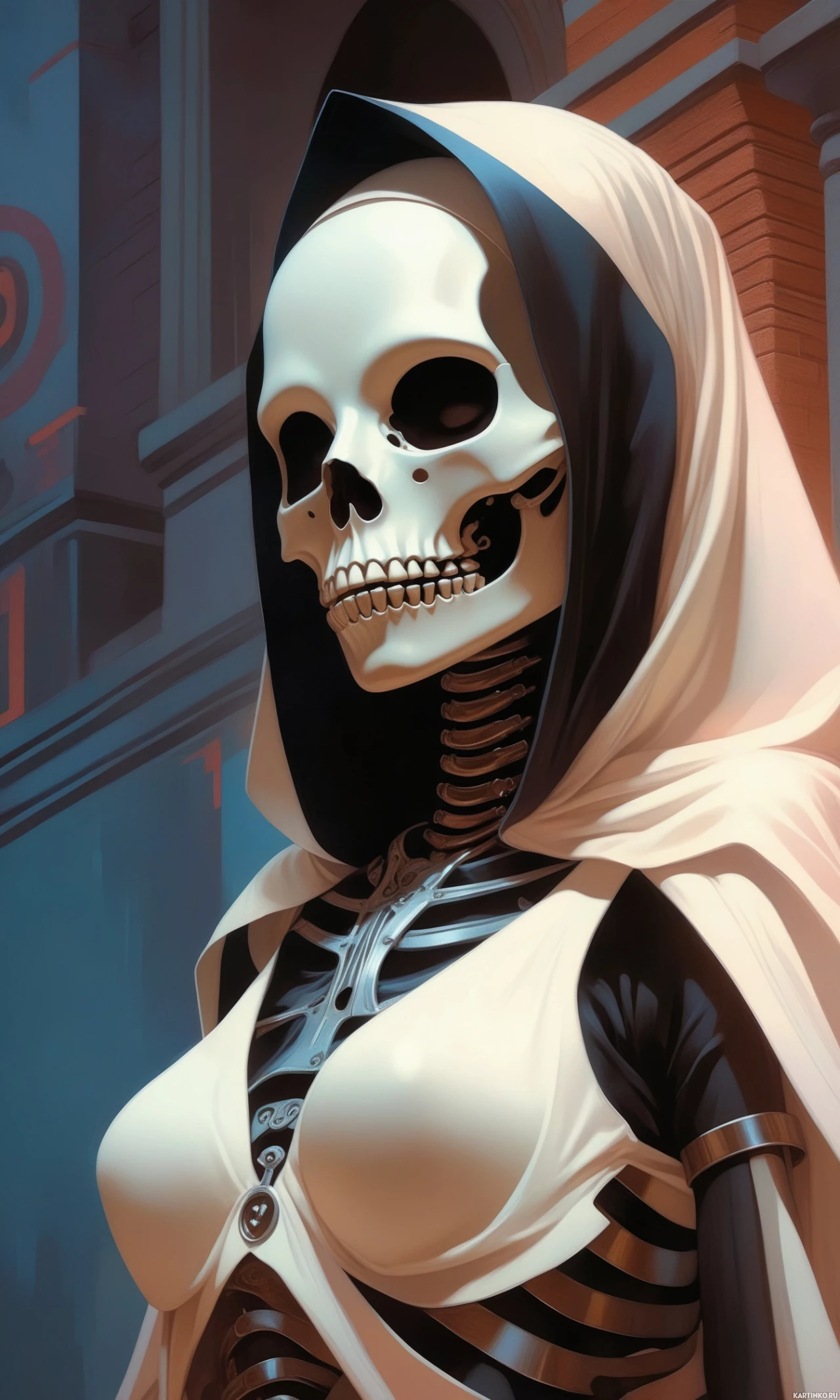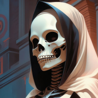 hooded character with skeletal features. The head is covered by a hood, and the figure is dressed in what appears to be a black or dark color robe or cloak, which drapes over its shoulders and chest. The face is not visible through the hood, adding