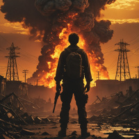 The image depicts a soldier standing in front of a catastrophic scene. The soldier, dressed in military attire with a backpack and holding a weapon, is positioned centrally facing the viewer from behind. In the background, there are large explosions with flames and smoke, suggesting a chaotic or war-like environment. The sky above is a dramatic orange and red hue, indicating either dawn or dusk, and it appears to be filled with clouds.