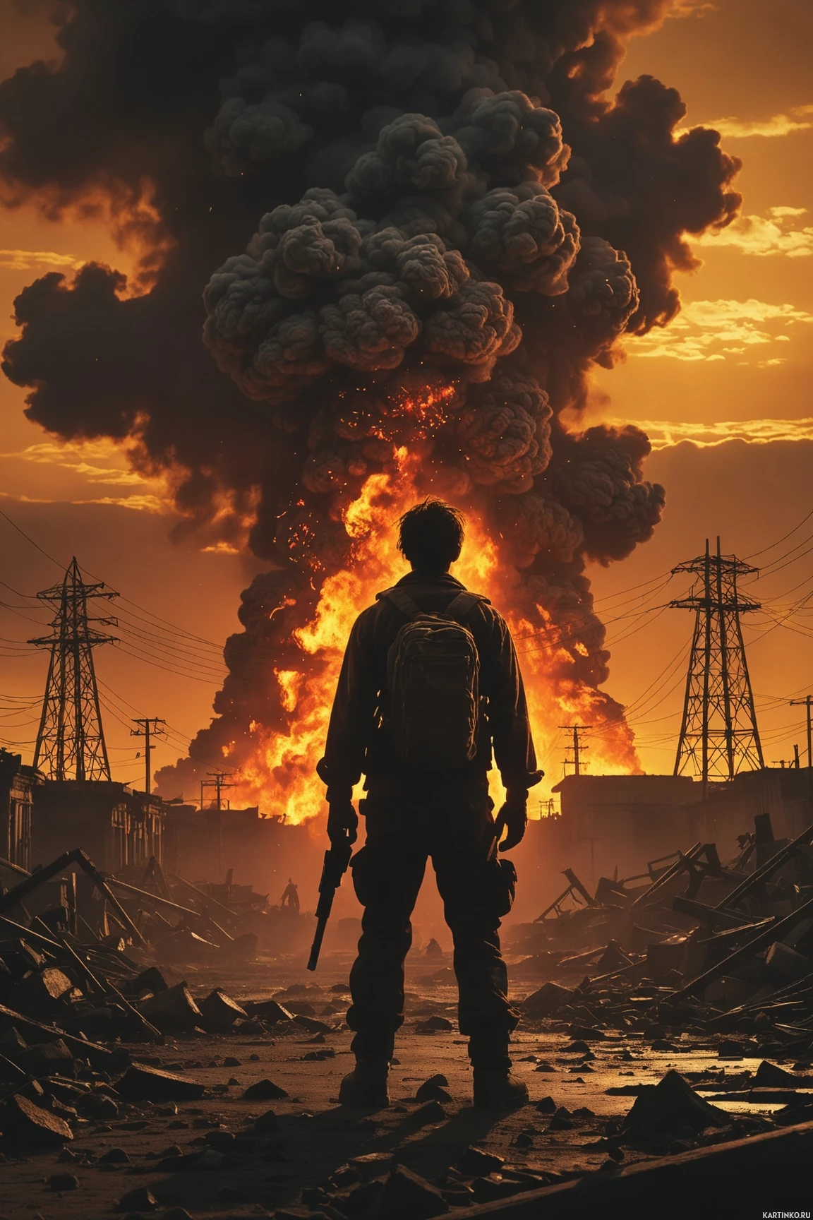 intense combat or an inferno. The soldier is equipped with a backpack and is holding what seems to be a weapon. The setting sun casts