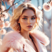 pink flowers, which may be cherry blossoms, providing a soft background that complements her outfit and adds to the overall aesthetic of the image. The lighting is warm and seems to have a focus effect in the center, highlighting her facial features.