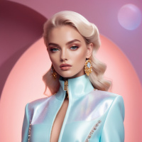 subtle eye shading that complements her facial features. She is wearing a futuristic or retro-inspired outfit that includes a light