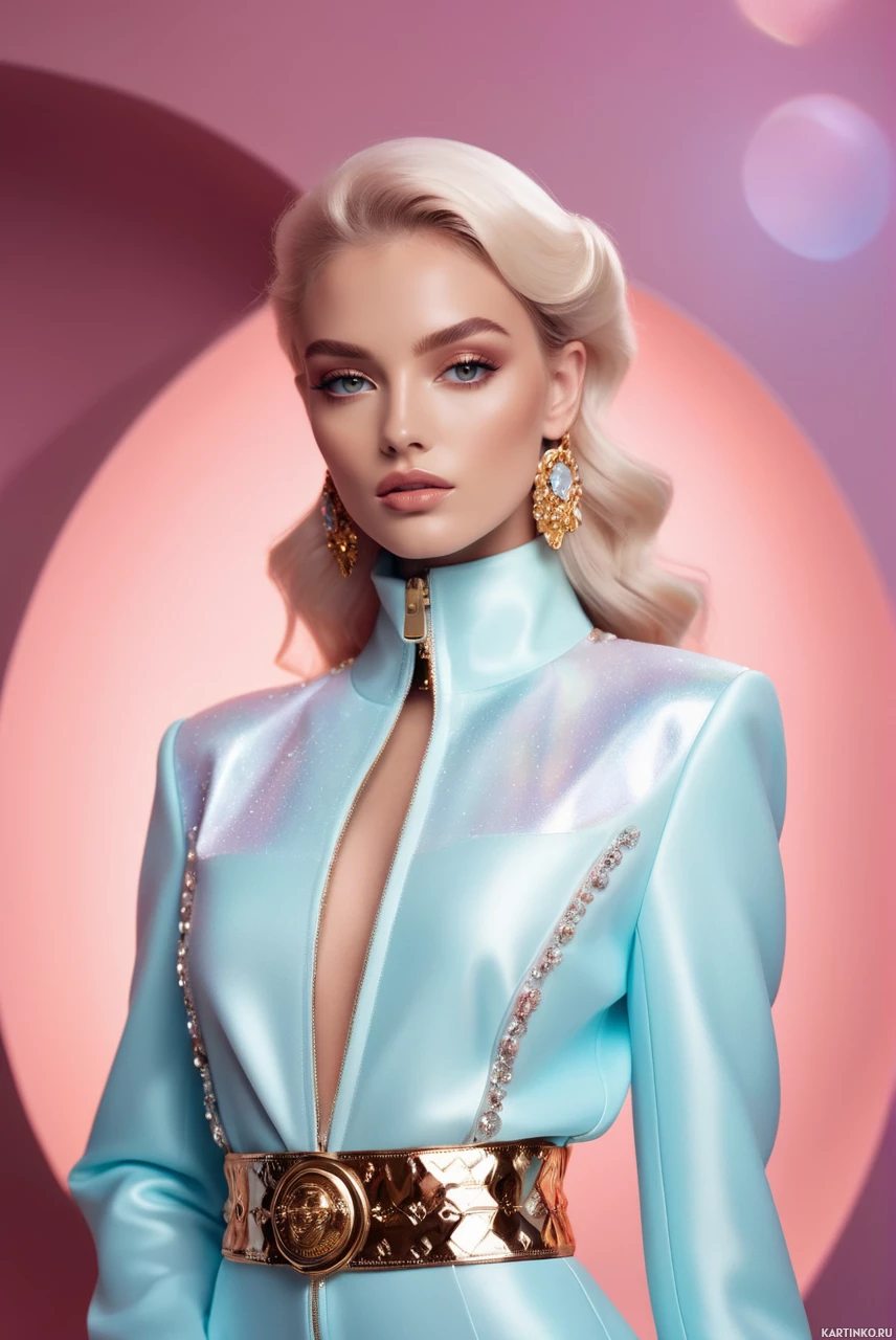a high collar and what appears to be an embellished or studded chest area, adding an edgy touch to her appearance. The background is simple yet vibrant, featuring circular lighting effects in shades of pink and purple that accentuate the model's figure and the outfit she is wearing. The lighting adds a dramatic effect and enhances the overall visual impact of the image.