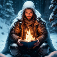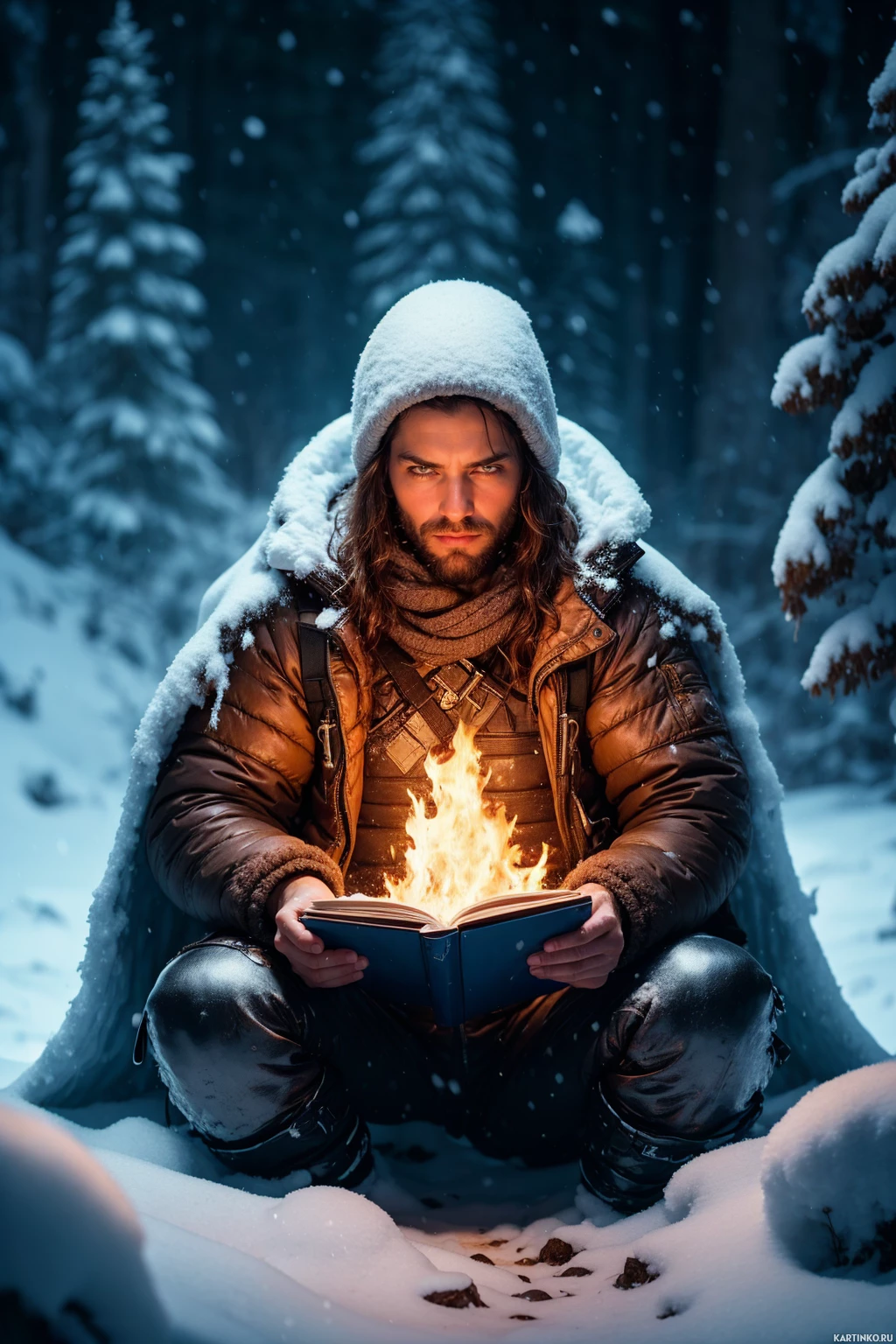 cold weather. The individual appears to be engrossed in reading a book, which they hold open with both hands. A flame, possibly from a candle or lantern, is placed next to them, providing