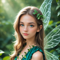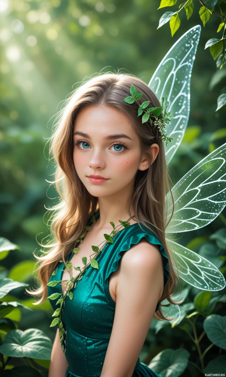 a green dress that has a texture resembling leaves or fabric designed to mimic foliage, which complements her character as a fairy or fantasy creature. The dress features a neckline that could suggest a corset-style garment and sleeves that are long yet appear slightly translucent. Her wings, spread out from behind her back, have