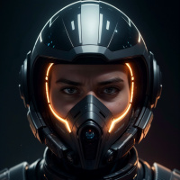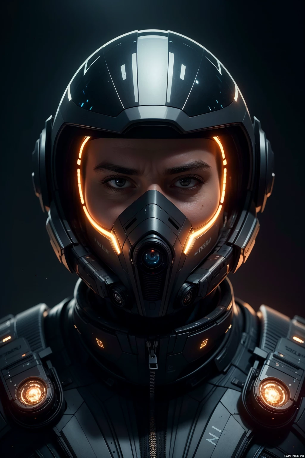 a science fiction theme. The helmet is sleek and modern in design, with a structural pattern on its front that could indicate technology or readouts. The individual appears to be male and is gazing directly at the viewer, which gives