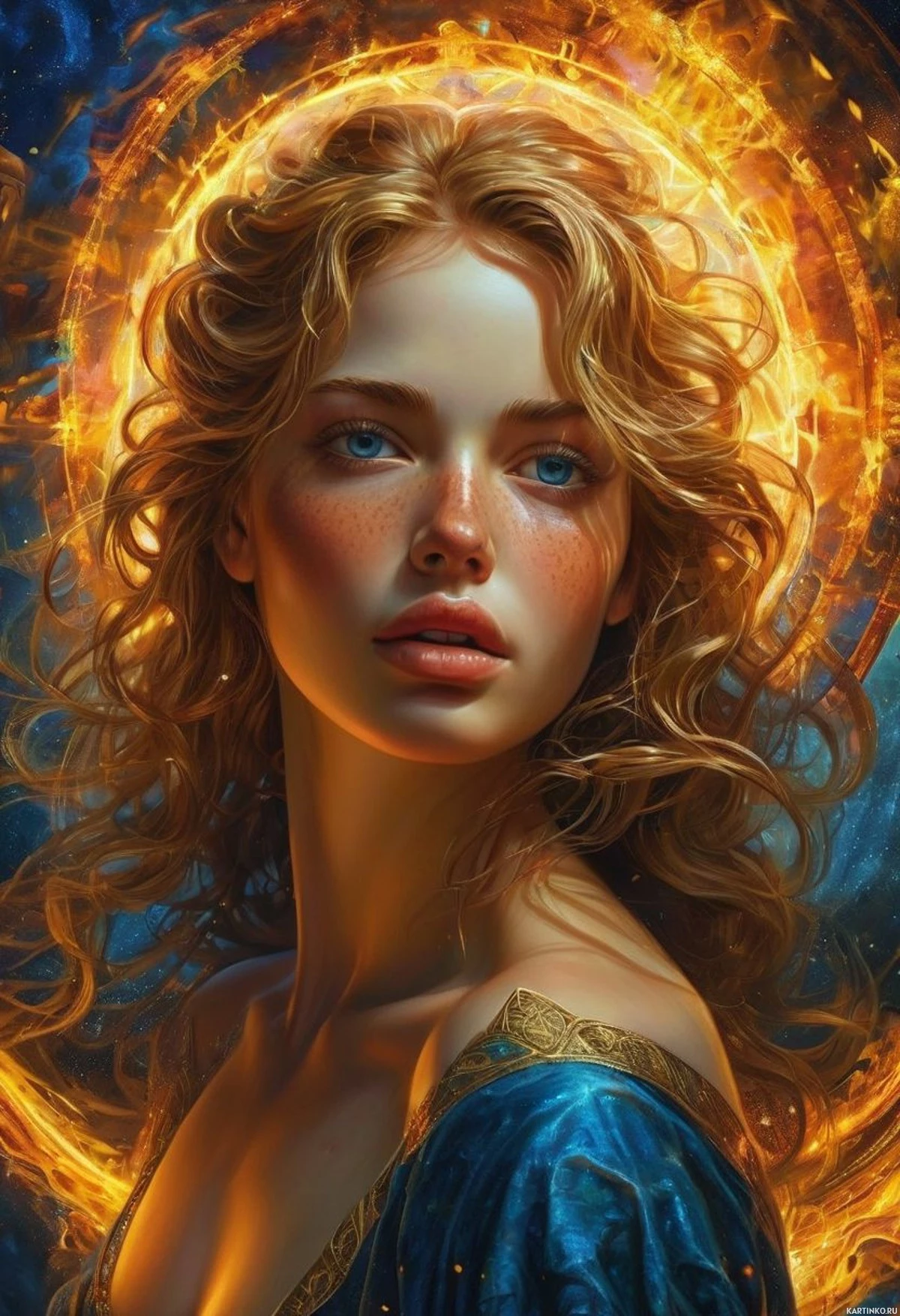 cosmic event occurring behind her head, which is framed by a halo-like glow. This scene suggests that she may be