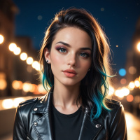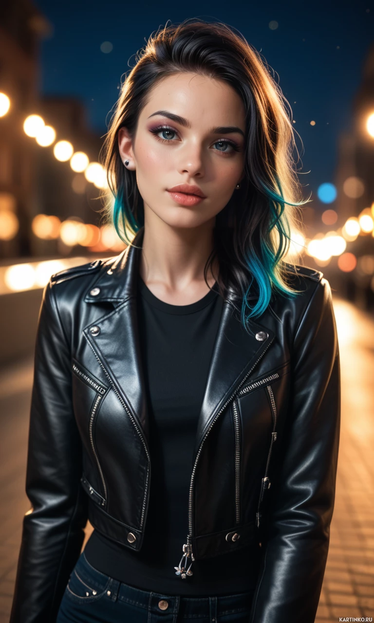 leather jacket over a top with no visible sleeves, suggesting a casual or urban style. The background is dimly lit, indicating that it's either nighttime or the area is not well-lit. There are