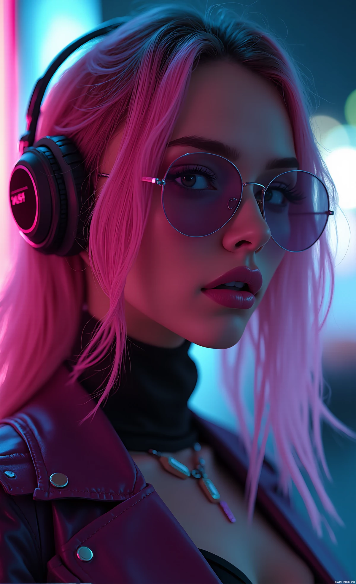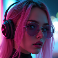 pink hair wearing sunglasses and headphones. She is dressed in a red