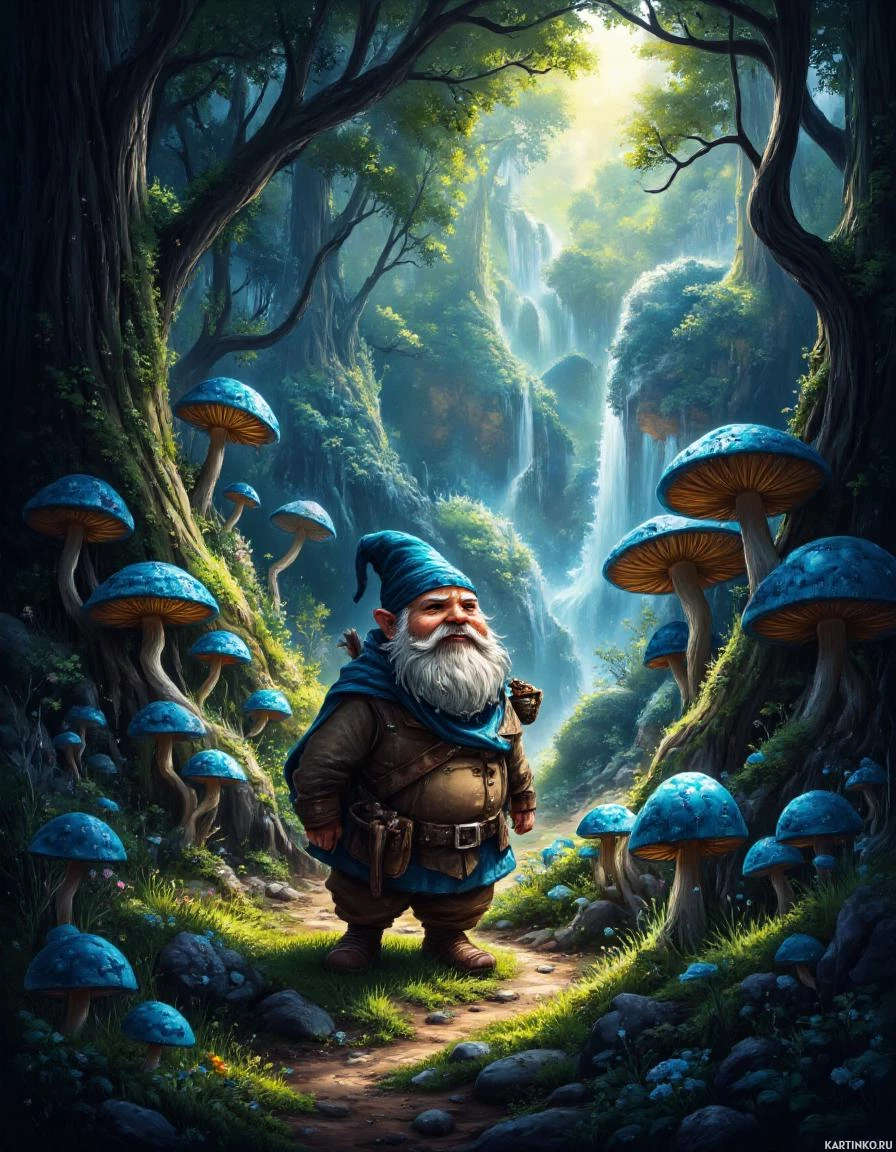 На картинке – сказочная сцена: гном стоит посреди леса из грибов. У него длинная белая борода, а на нём синий плащ. Позади него – огромный водопад, спускающийся по зеленому склону, также усыпанному грибами. Общее настроение картинки передаёт атмосферу таинственного, заколдованного леса.