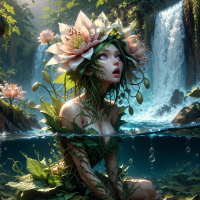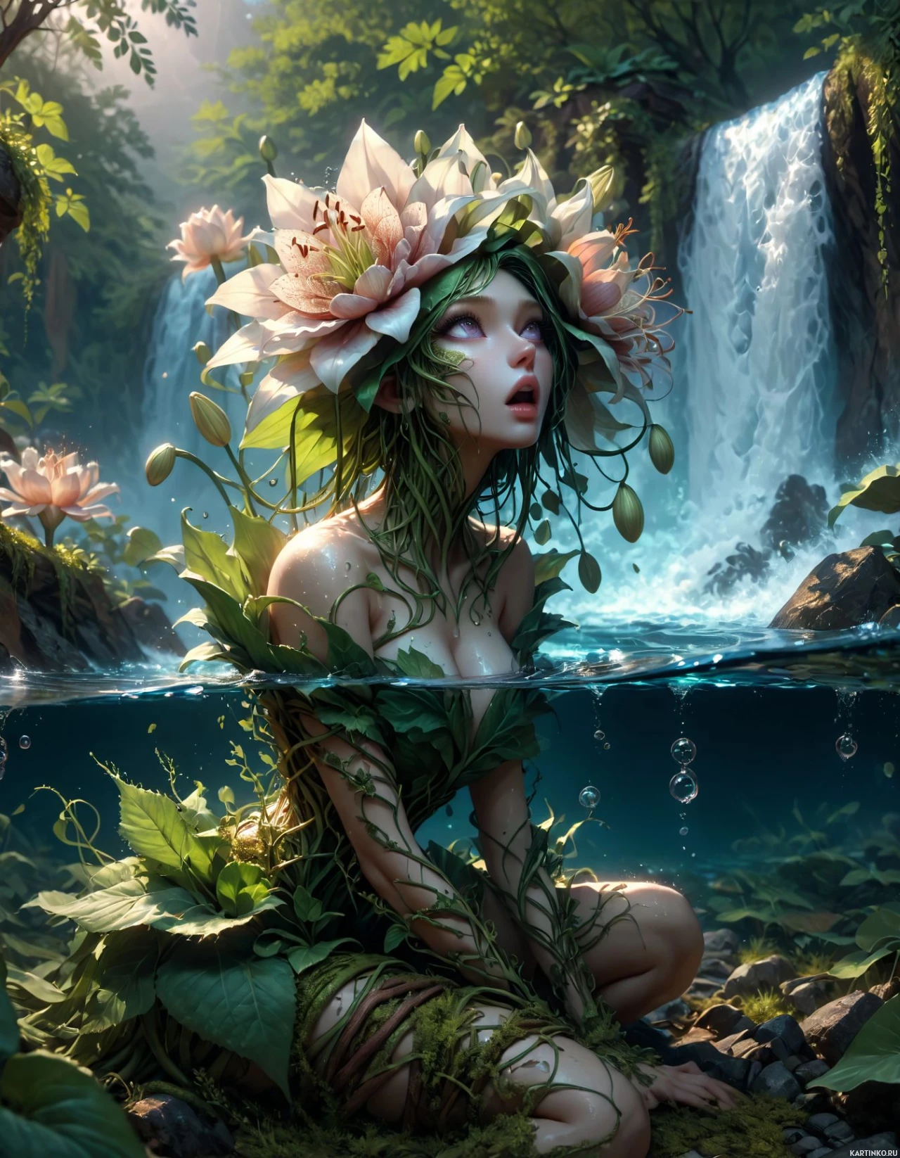 green skin and is adorned with flowers, particularly pink ones around her face and body. Her hair is plant-like and green as well. She is sitting under water, surrounded by various