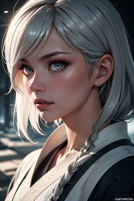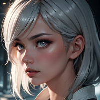 blue eyes and her lips are parted slightly as if she's looking or speaking. Her expression is neutral, and her gaze seems to be directed towards something not visible within the frame of the picture. The character is wearing a detailed outfit that includes a headpiece with what appears to be some kind of