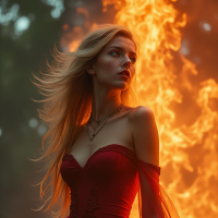 a slight tilt to her head. The background is filled with bright orange flames, creating