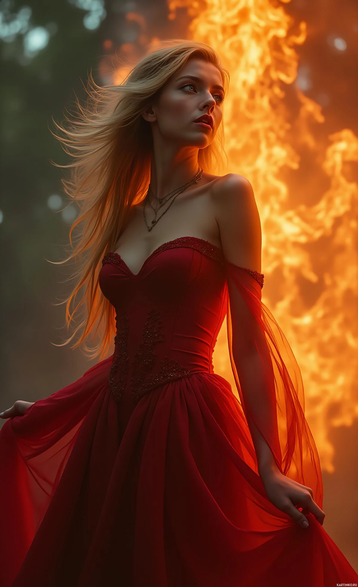 blonde hair and is wearing a red dress with ruffled sleeves and a sheer overlay that billows out behind her, suggesting movement. Her gaze is directed to the side, and there's