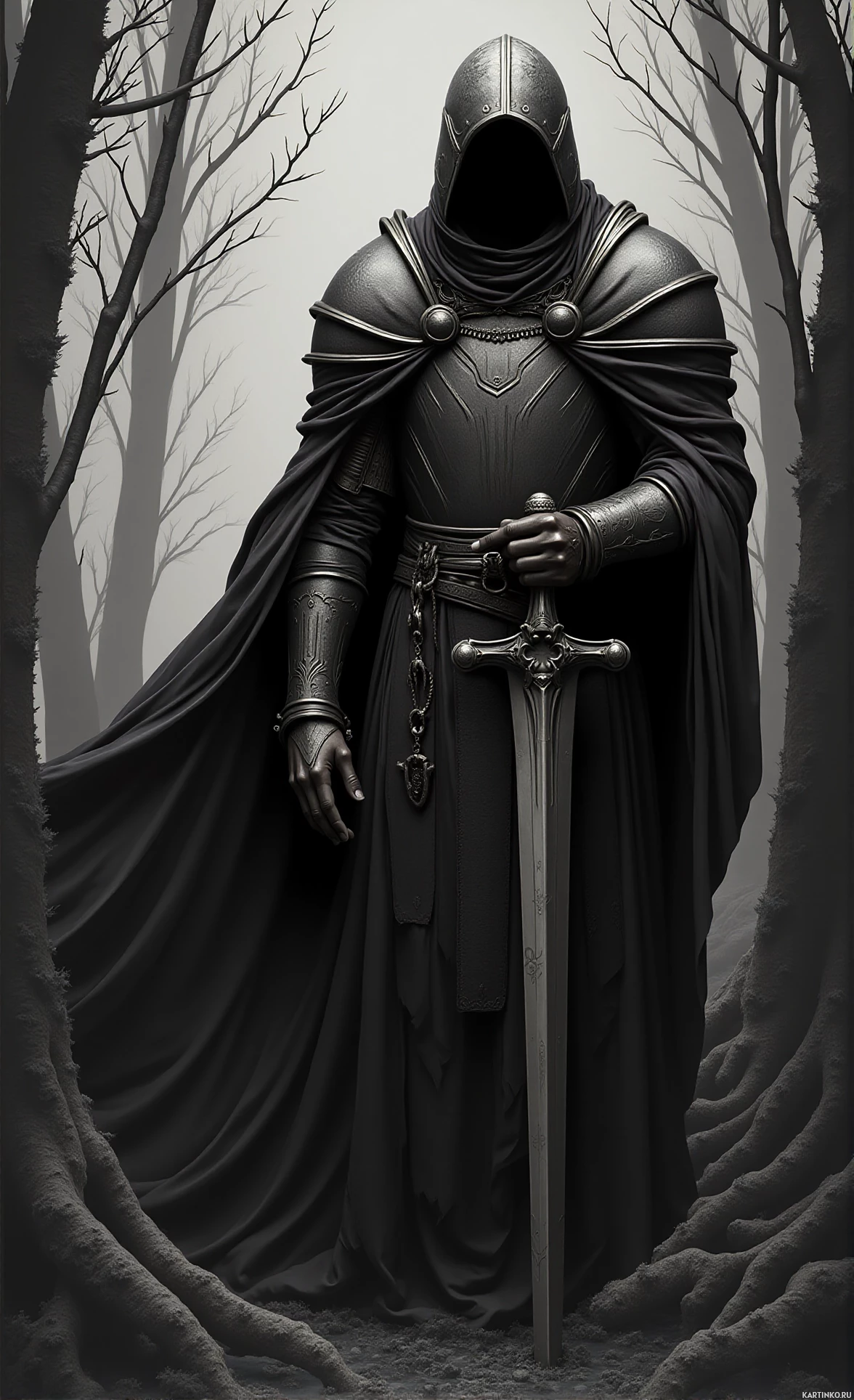 an ominous forest or grove, which might imply a scene from a story set in a mystical or otherworldly setting. The hood of the warrior's cloak is obscuring their face, adding an element of mystery and leaving room for imagination about the character's identity or motivations.