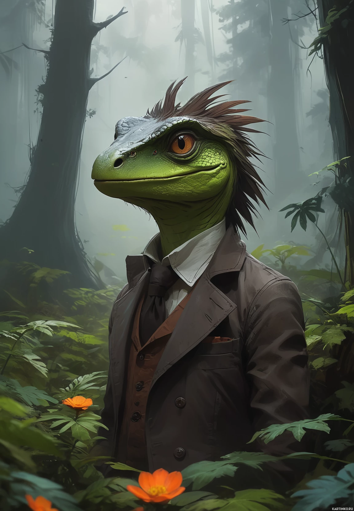 the body structure of a lizard, with scales and a long tail. However, it is dressed in human-like clothing, including a suit, tie, and hat, giving it a humanoid appearance. It also possesses human facial features such as eyes, eyebrows, and ears. The character's stance and attire suggest it might be engaging in human-like activities or posing for the portrait. The background consists of dense green foliage and mist, creating a mysterious atmosphere, which is typical for