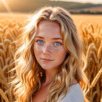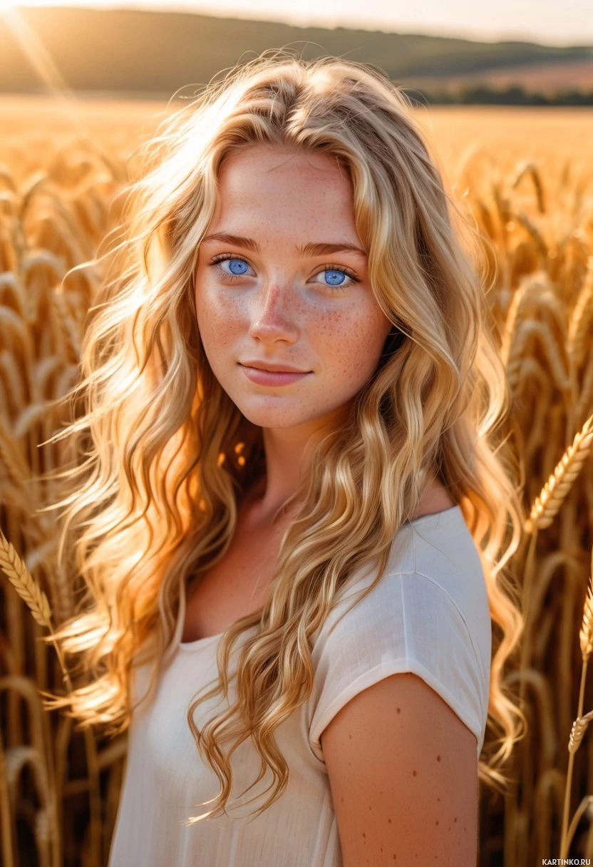 sleeveless top that flows around her shoulders. The background features a field of golden wheat with the sunlight glistening on it, suggesting either