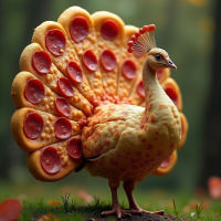 slices of pizza as part of its plumage, in place of traditional feathers. The background is blurred but suggests a forest setting with dappled light, which adds to