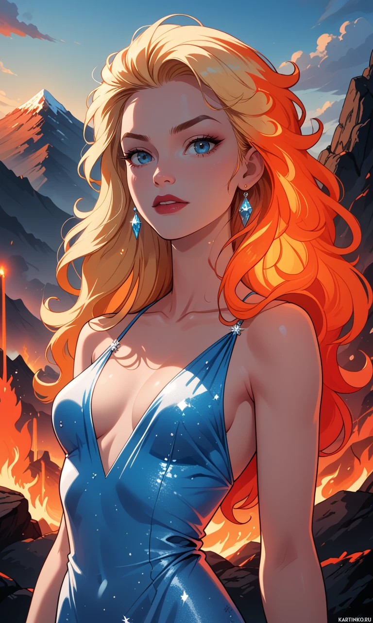 На картинке изображена девушка, стоящая на фоне яркой, будто взятой из видеоигры или цифрового арта. У нее длинные красные волосы, и она одета в облегающий синий костюм, напоминающий доспехи. Выражение лица нейтральное, губы слегка приоткрыты, взгляд направлен на зрителя. На заднем плане – драматический пейзаж с пересеченной местностью, облачным небом и пламенем на переднем плане, что создает ощущение сцены конфликта или напряженного действия в игровом или повествовательном контексте.
