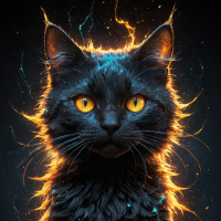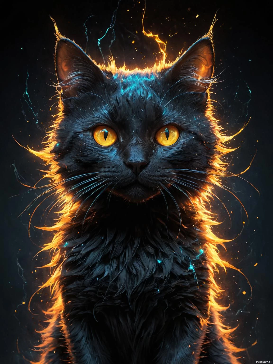 a black cat with striking yellow eyes. It has