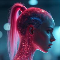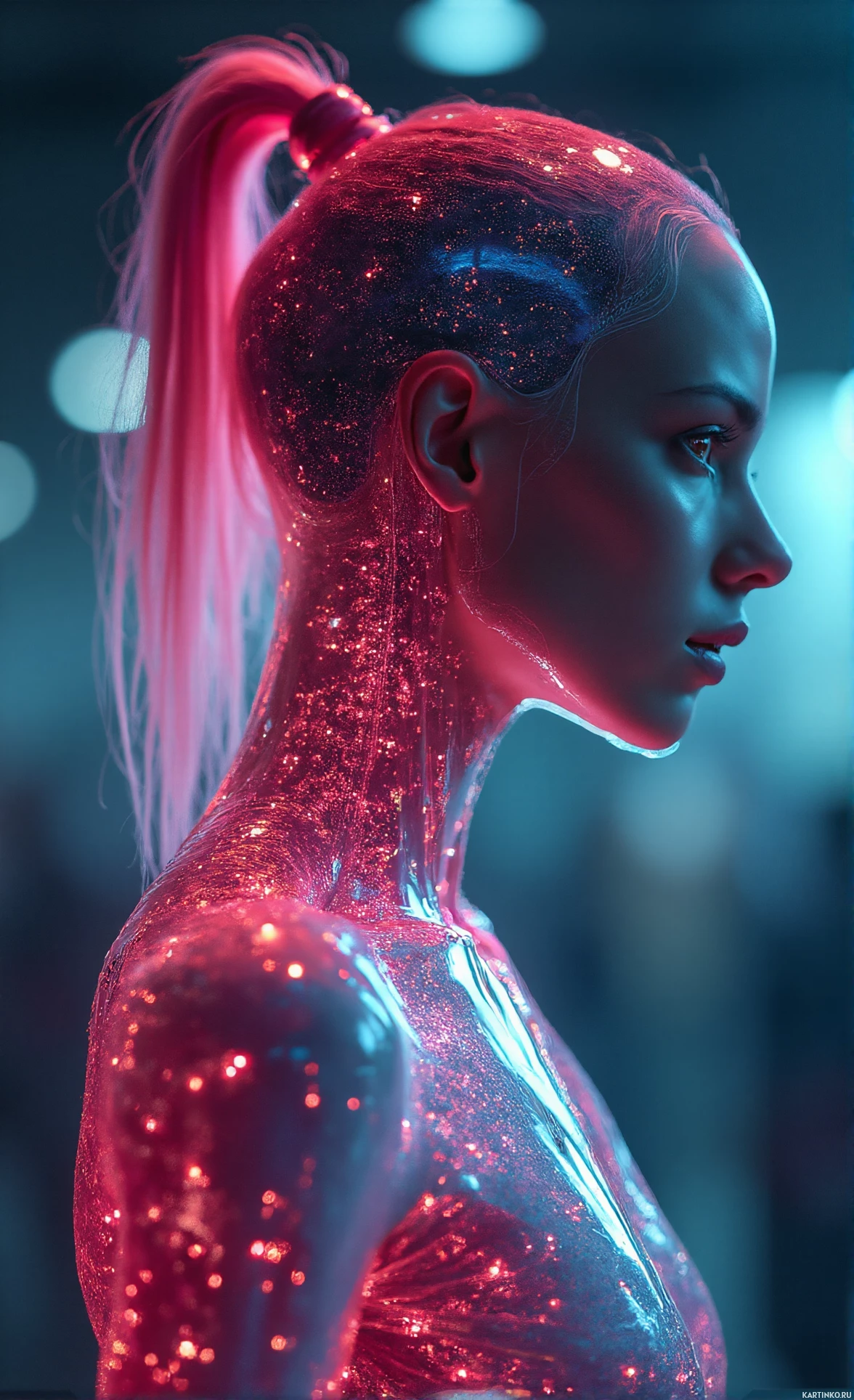 a science fiction setting. The individual is adorned with a shimmering, glittery bodysuit that seems to glow and sparkle, suggesting a futuristic or otherworldly theme. The expression on the person's face is calm and introspective, looking slightly away from the viewer, which adds to the overall ethereal and sci-fi atmosphere of the image.