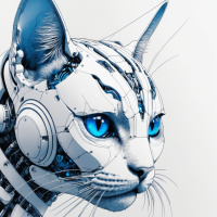 science fiction with the concept of a cybernetically enhanced animal, specifically a feline. The robot cat has intricate