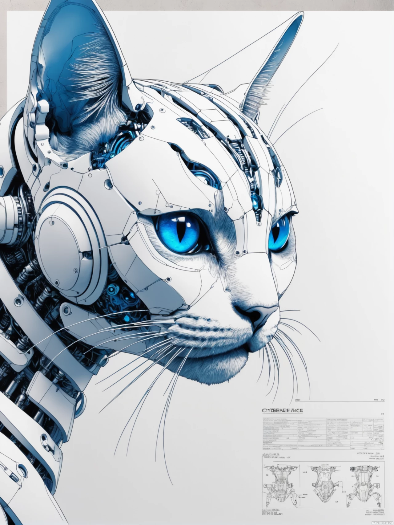 feline eyes. The artwork is likely intended to evoke a sense of the future of technology intertwining with living creatures, raising questions about ethics, identity, and the boundaries between organic and inorganic