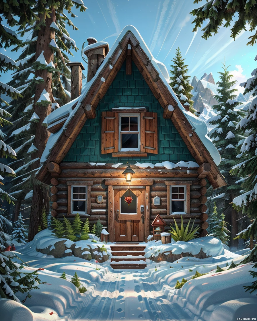 shades of blue and green, with white trim around the windows and door. It is set against a backdrop of a snow-