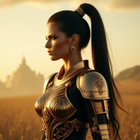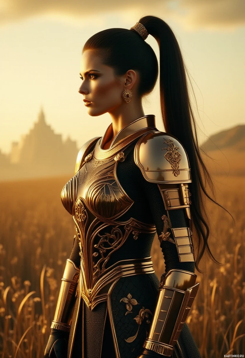 dark hair styled in a braid and is wearing detailed armor that includes a breastplate and shoulder guards. The armor has