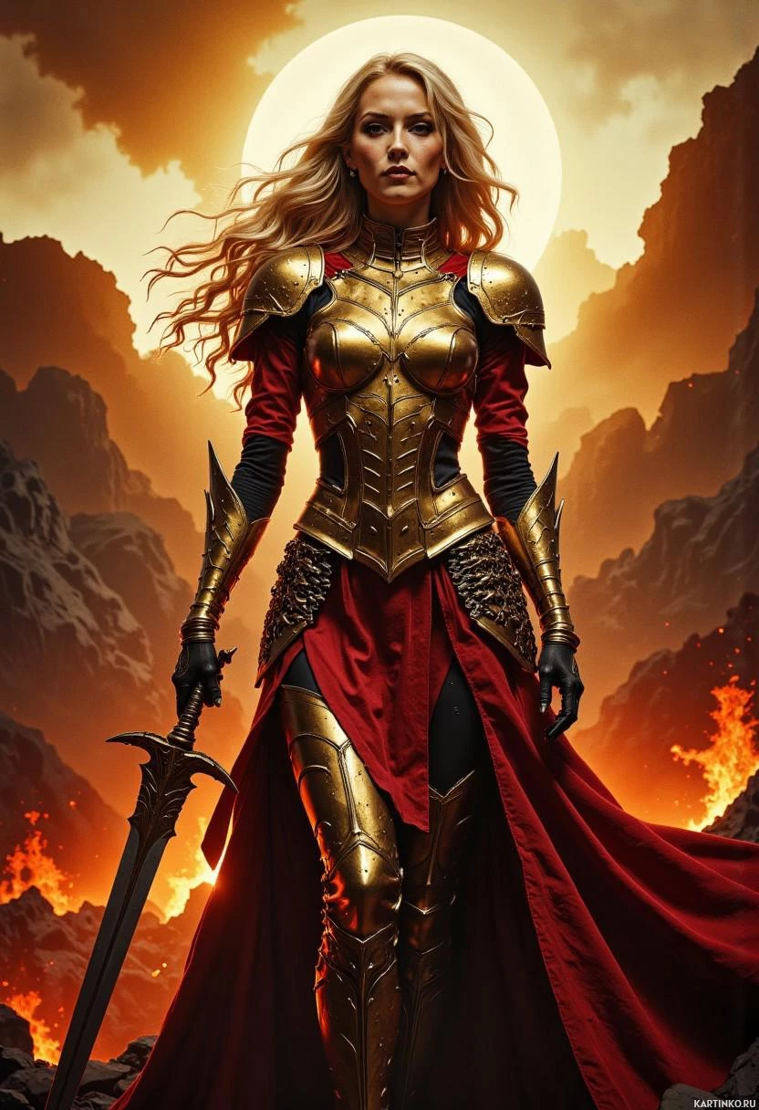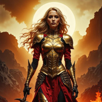 a golden armor and carries a sword, embodying the fierce spirit of a battle-ready heroine. Her long