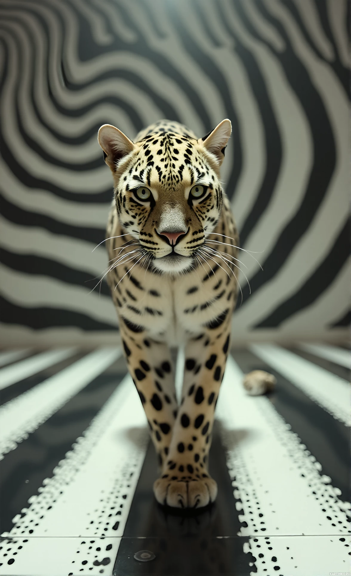 На картинке изображён леопард в помещении с черно-белой плиткой на полу. Животное показано спереди, идёт прямо на камеру, взгляд сосредоточенный, уши насторожены. Окрас шерсти соответствует типичному для вида – смесь коричневых пятен на светлом фоне. Освещение создаёт тени, придающие сцене глубину.